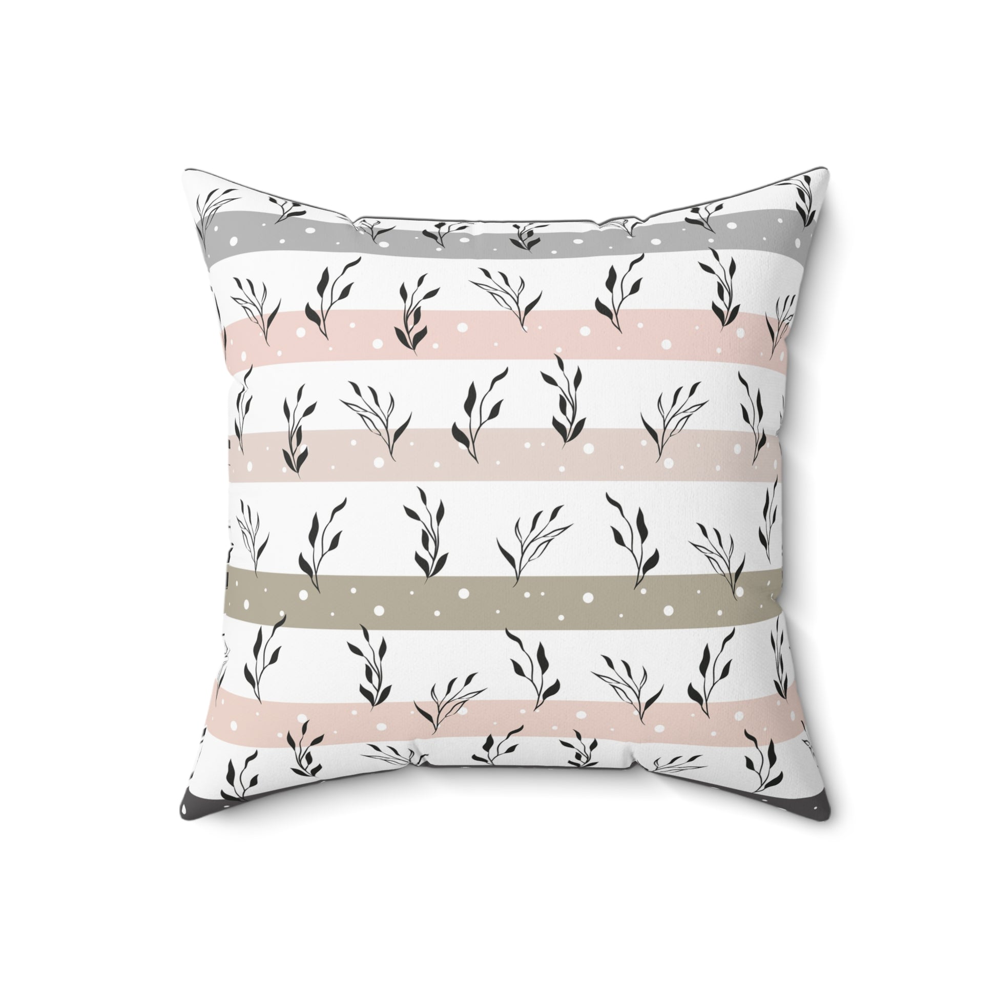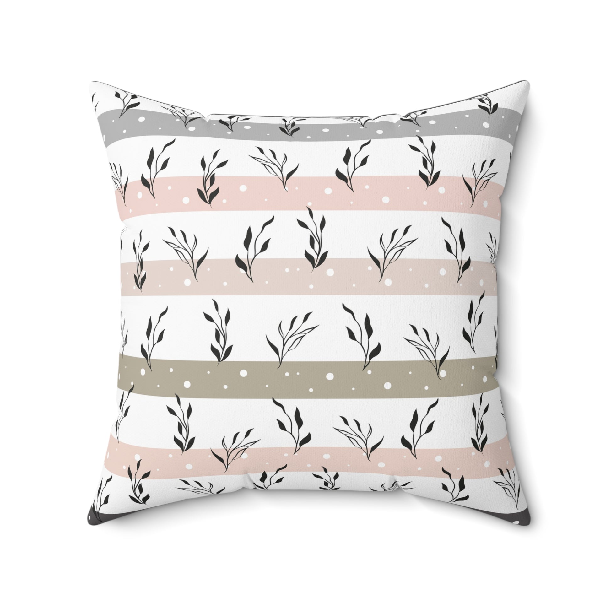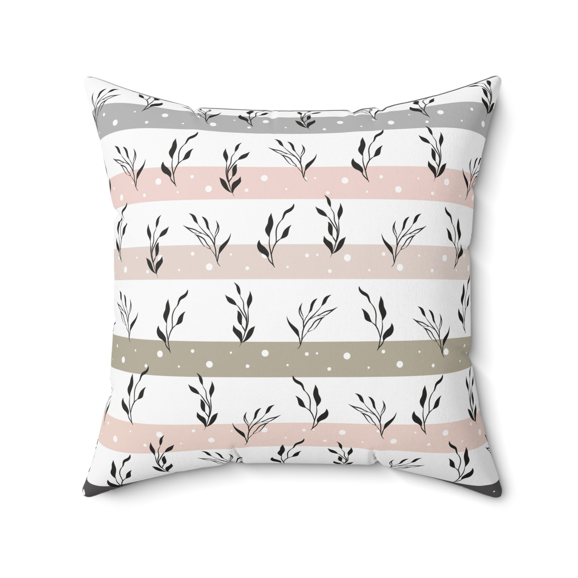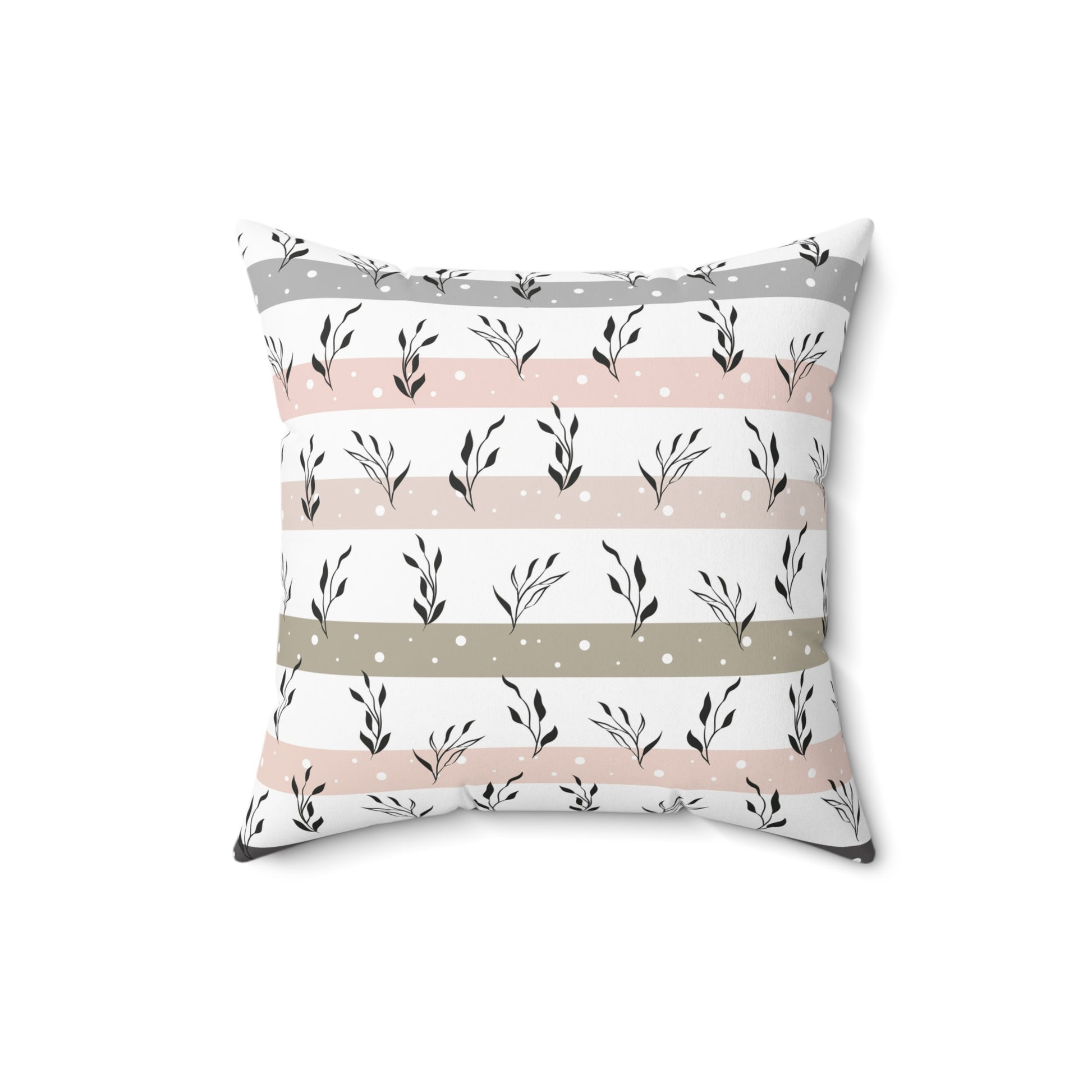 Soft, breathable square pillow with a calm, botanical stripe design in muted blush, warm gray, and olive. Double-sided print keeps the pattern visible from every angle while the concealed beige zipper blends with the palette for a clean finish. The recycled polyester insert ships vacuum-packed and slides in to give the cover a plump, lofted look—arrives unassembled so fabrics stay crisp in transit. This pillow brings a quiet, cozy accent to a reading nook, nursery, or living room, layering easily with textured throws and natural wood furniture.