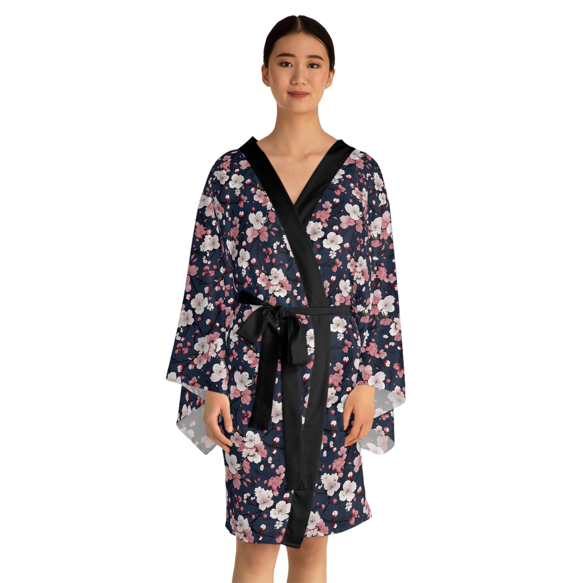 Soft, flowing, and effortlessly elegant — this mid-length kimono robe wraps you in a quiet, floral hush. Lightweight fabric skims the body and the wide bell sleeves move like a slow breath, turning ordinary mornings into calm rituals. The deep navy ground is scattered with delicate pink and white blossoms, giving the robe a timeless, hand-painted feel. A contrasting black trim and sash add structure and polish while keeping the look versatile: lounge in it at home, layer it over eveningwear for a relaxed party look, or pack it as a travel companion that won’t crease easily. It feels cool to the touch, dries fast, and keeps its silhouette through wear. Gentle-care instructions help preserve the print and finish so the colors stay true. Product features - Mid-length kimono cut with long, flowing bell sleeves and matching belt - 100% polyester — lightweight (160 g/m²), durable, quick-drying fabric - Versatile use: wearable as a robe at home or styled as a party cover-up - Smooth, figure-flattering drape with contrasting front trim and sash (black or white only) - Care: gentle washing recommended; avoid vigorous rubbing and alkaline detergents Care instructions - Do not dryclean - Iron, steam or dry: low heat - Do not tumble dry - Do not bleach - Machine wash: cold (max 30C or 90F)