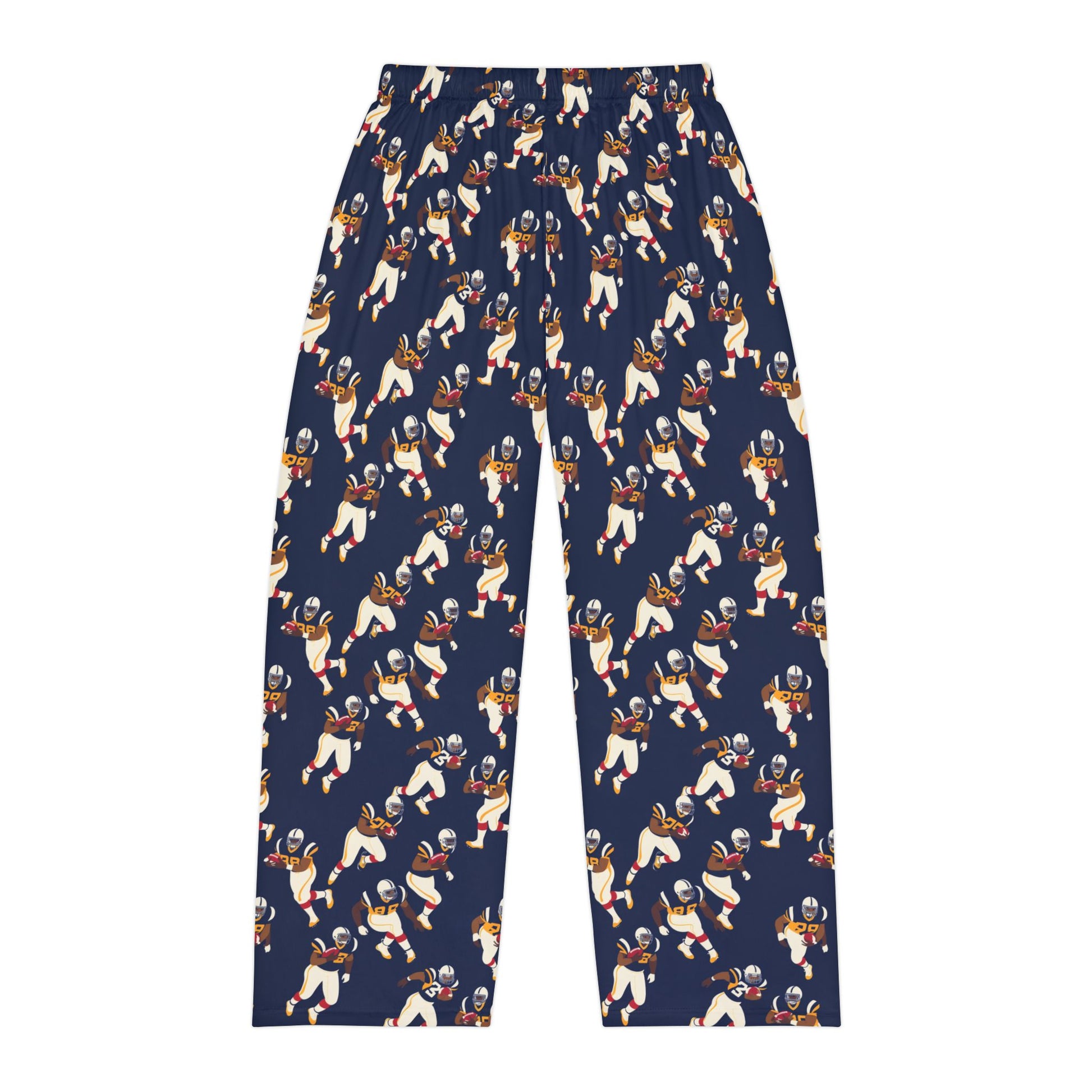 These pajama pants bring the quiet thrill of game day into every cozy hour. Soft, brushed polyester hugs the skin with a smooth hand-feel while an all-over football player pattern keeps the spirit of the field alive whether you're winding down after a long day or settling in for a weekend of highlights. The lightweight fabric and elastic waistband make them easy to move in — for stretching on the couch, cheering from the sofa, or drifting off mid-game. Subtle, printed size and care info inside the waistband keeps the exterior clean and simple, and neutral seam threads blend with the print so the pattern stays uninterrupted. Made with durable materials and assembled in the USA, these pants are built to hold their shape and color through many seasons of watching, celebrating, and relaxing.