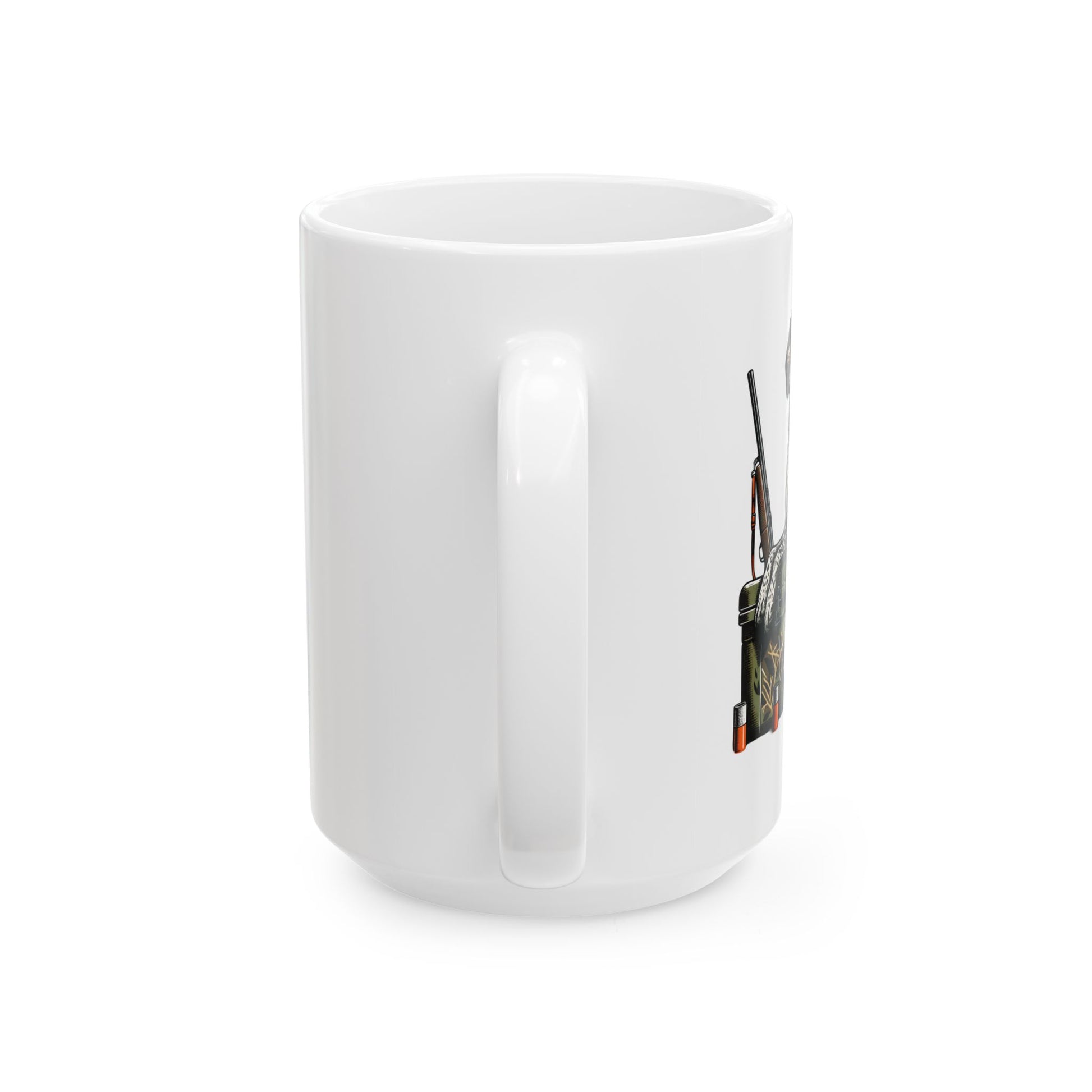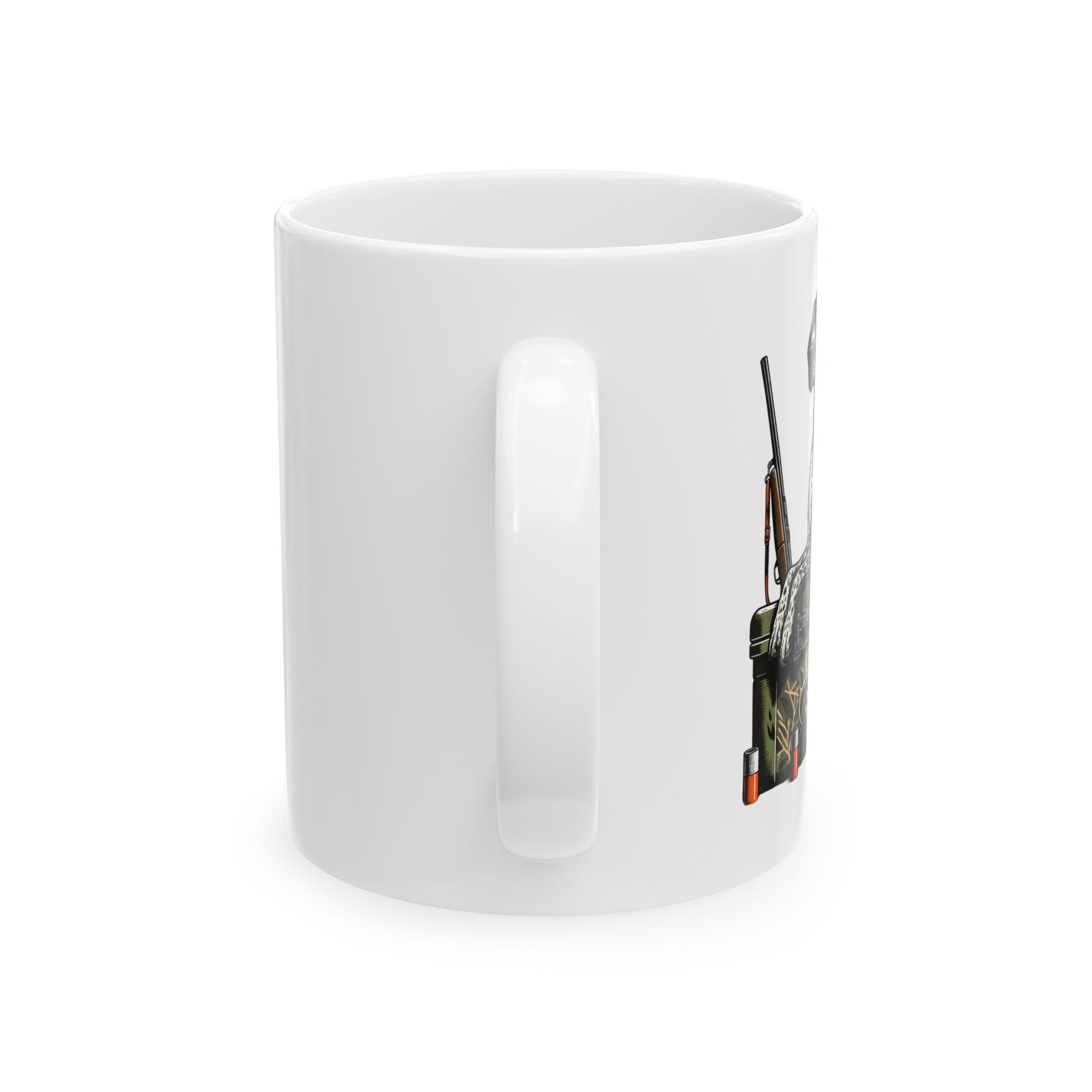 A sturdy ceramic mug that brings a little field-side humor to your morning routine. The crisp, full-color illustration shows a vigilant hunting dog perched on a camo crate beside decoys and a shotgun — a quiet nod to early mornings, cold blinds, and the patient focus of the hunt. Thick glossy white ceramic makes the artwork pop and the wide C-handle feels secure in your hand during slow-sipping moments or quick refills. Use it while prepping gear, swapping stories at the cabin, or warming up after a sunrise sit; the rugged, familiar scene will fit right into those ritual moments.