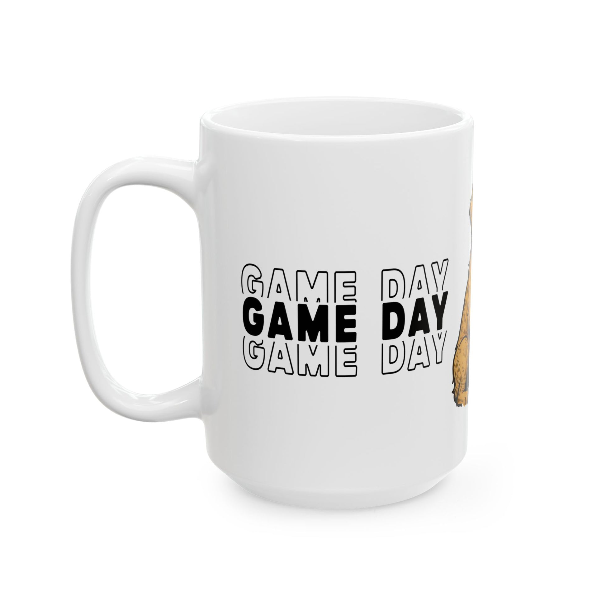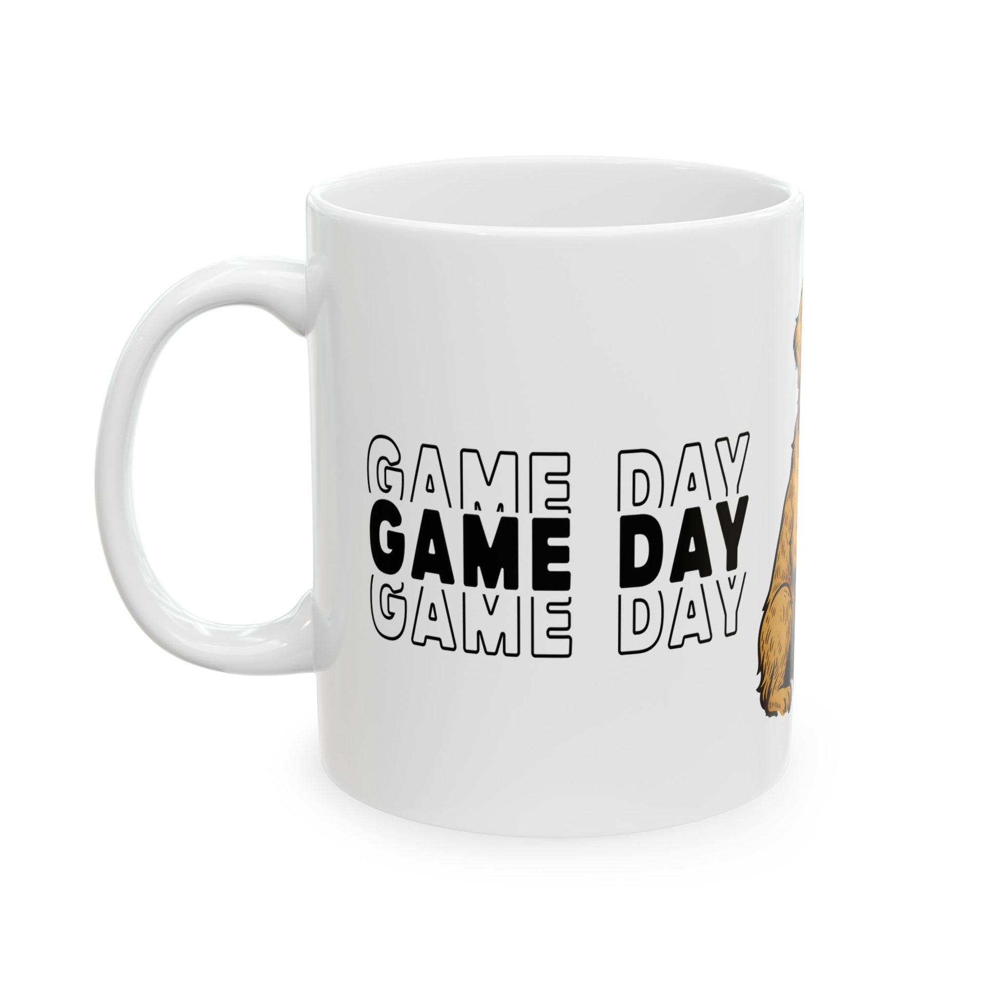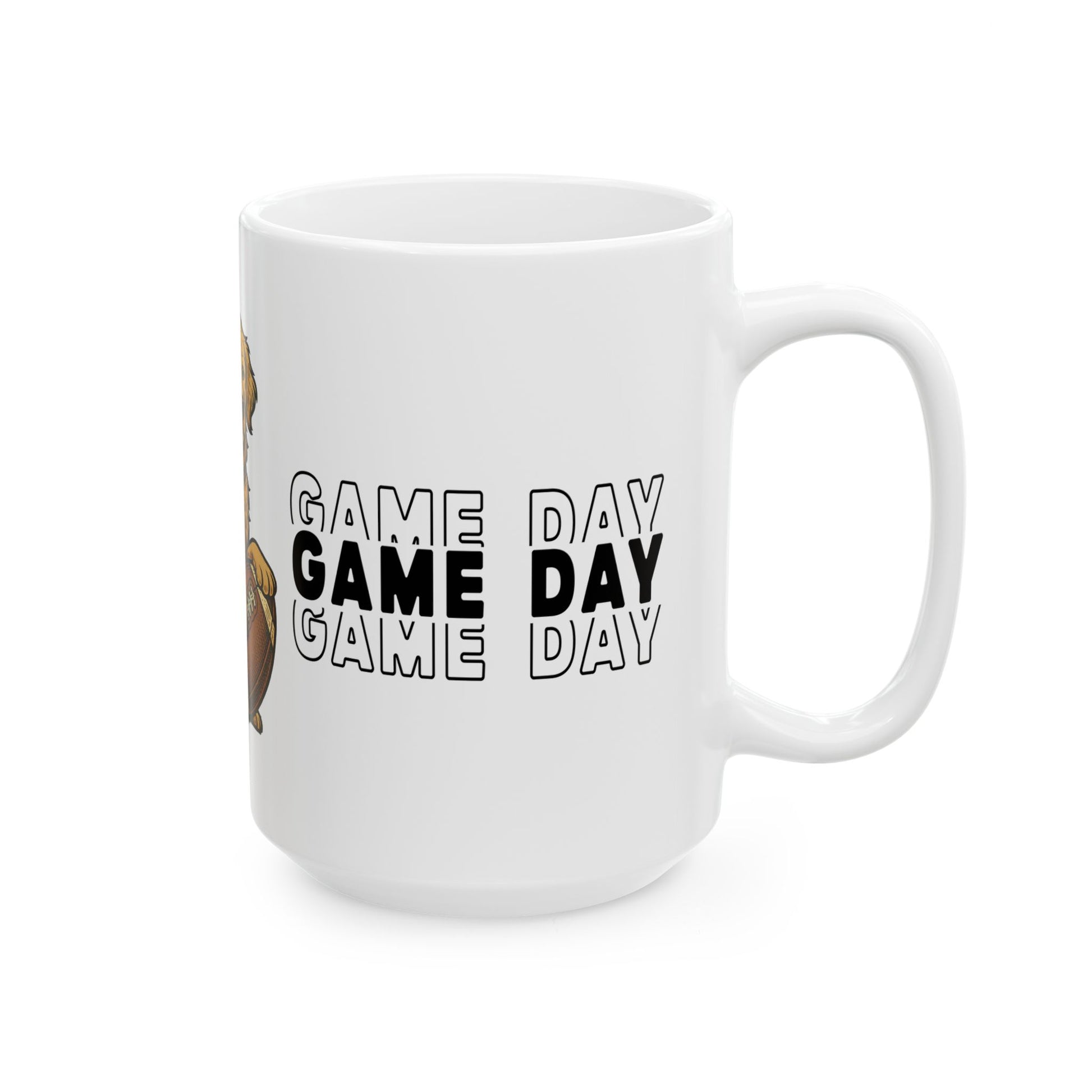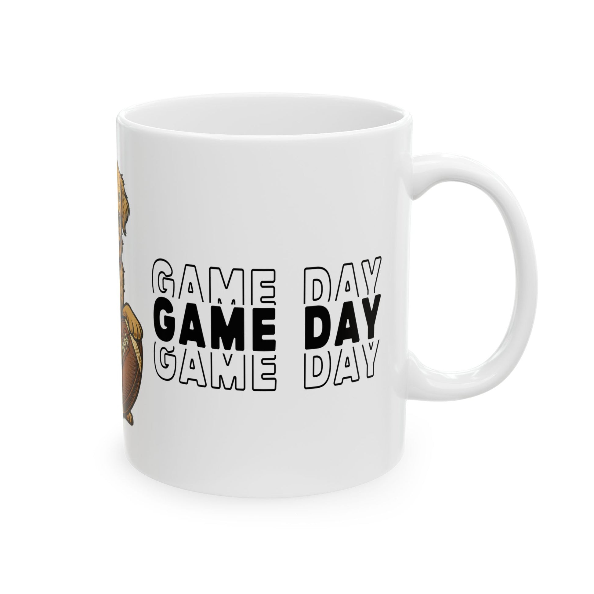 Warm, playful, and built for game day mornings — this glossy ceramic mug brings a little canine joy to every sip. A friendly golden retriever puppy sits with a football, its soft fur and wagging expression printed in vibrant, true-to-design colors that pop against the pristine white ceramic. The comfortable C-handle and shiny finish make it easy to cradle on chilly tailgate mornings or during halftime coffee breaks. Durable, lead- and BPA-free construction means you can reach for it every day — whether you’re fueling up before the big match or winding down while replaying the highlights. Available in two sizes to match your pour and appetite for caffeine.