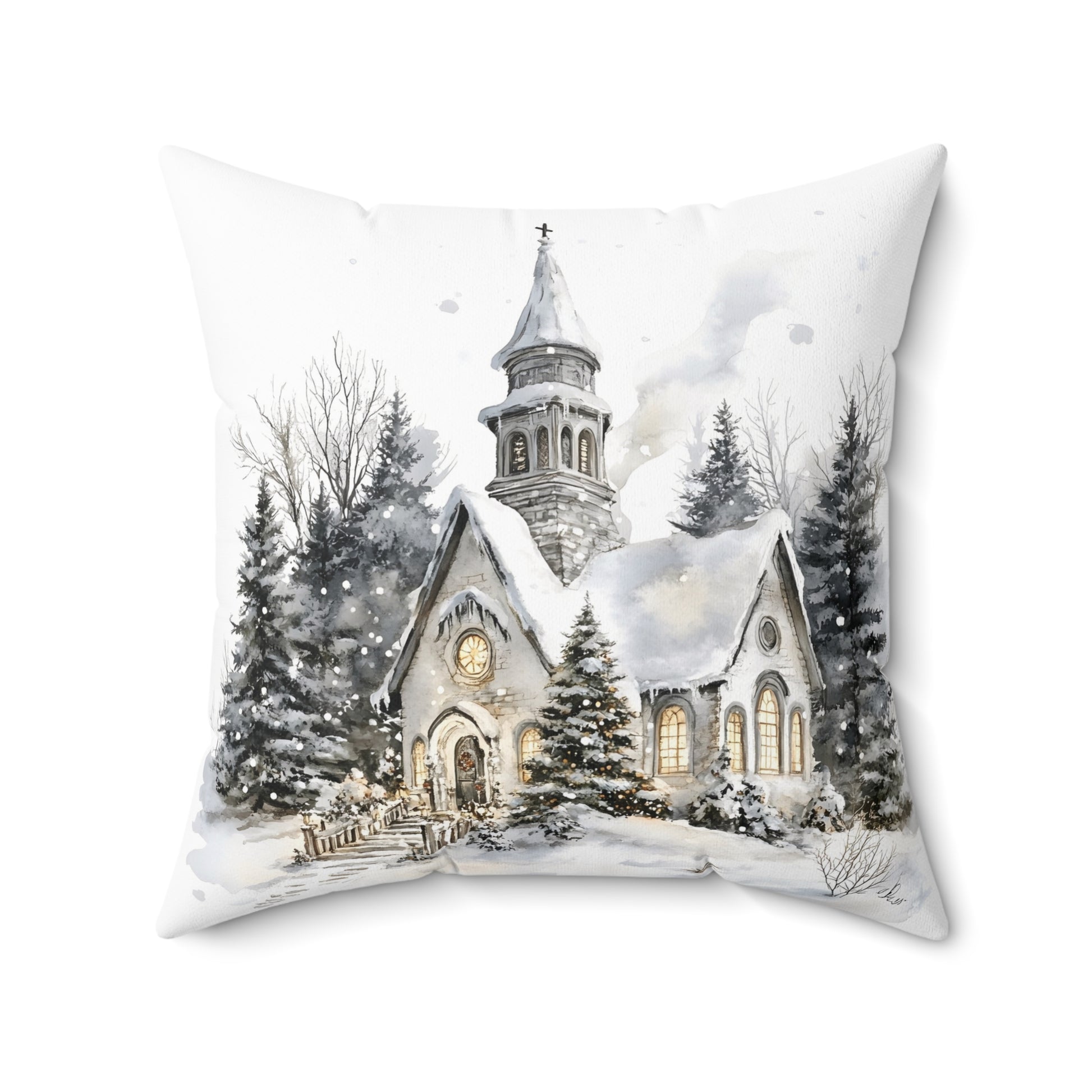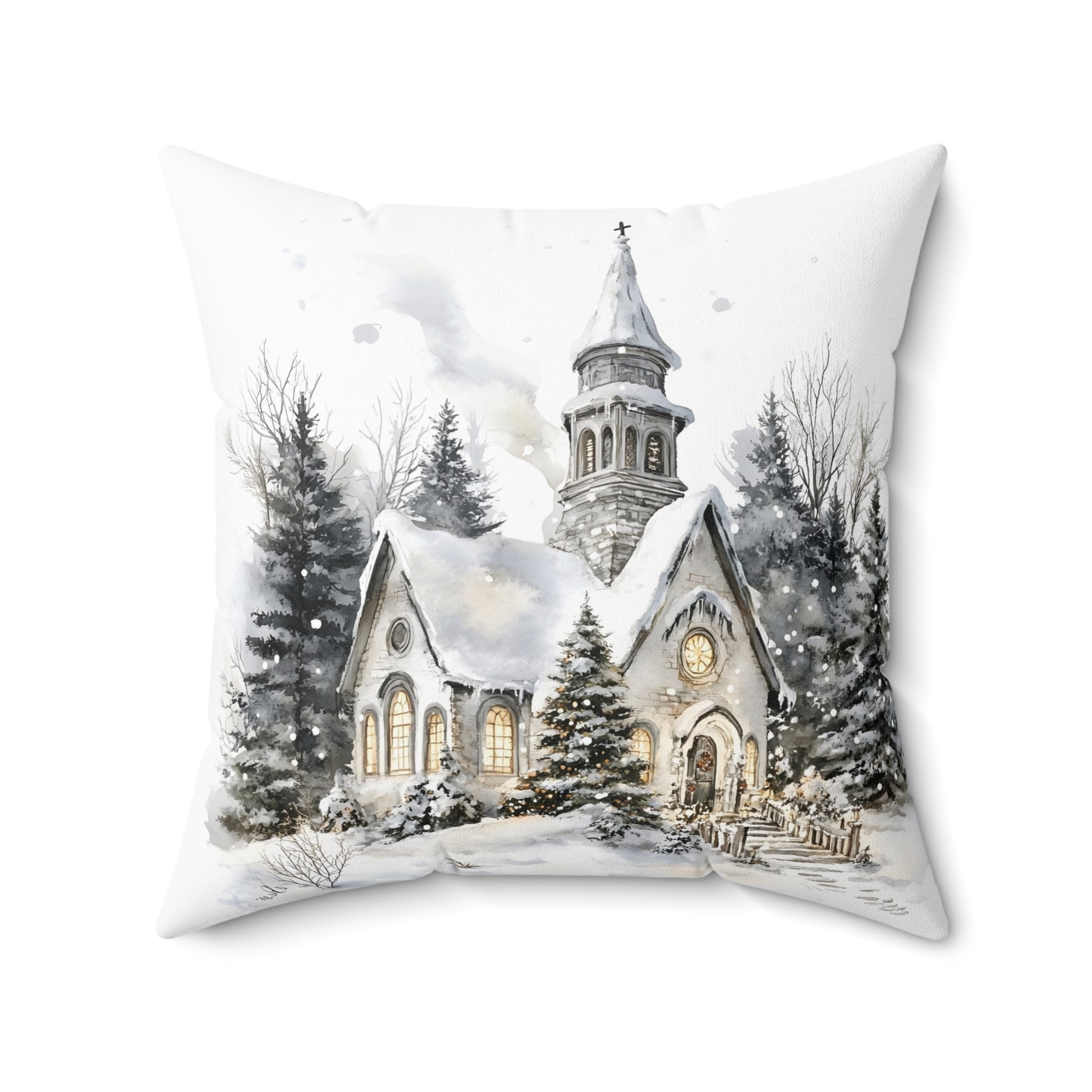 Winter Church Scene Spun Polyester Square Pillow — Cozy Holiday Throw Pillow