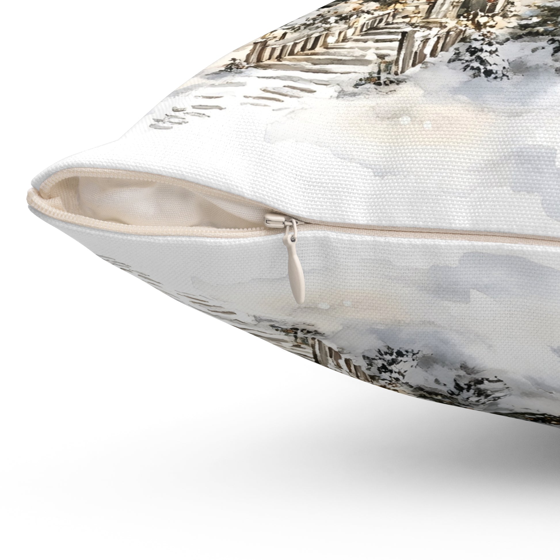 A spun polyester square pillow that brings a quiet, wintry evening into your living room. The double-sided print shows a small church settled in snow, soft streetlamps glowing against a pale sky. It feels like slipping into a wool blanket and settling by a frosted window—gentle, calm, and familiar. Lightweight yet structured, the pillow keeps its shape and adds a layered, rustic touch to a sofa, bench, or reading nook. For someone who treasures slow, candlelit evenings or seasonal décor that leans toward understated charm, this pillow quietly sets the scene for a cozy night in or a subdued holiday display.